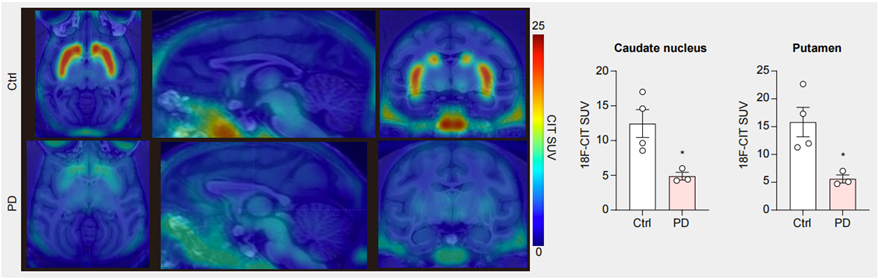 ●  分子影像數(shù)據(jù)展示造模后,動(dòng)物腦內(nèi)多巴胺神經(jīng)元損傷;